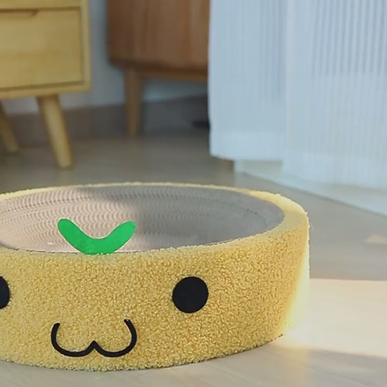 Acogedora cama rascadora redonda para mascotas, perfecta para que tu compañero descanse y afile sus uñas con estilo. Su divertido diseño de carita sonriente en color amarillo agrega un toque alegre a cualquier espacio.
