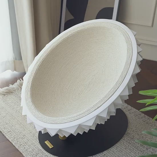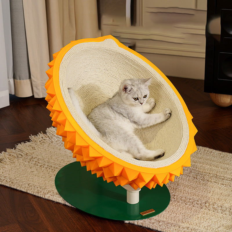 Cama con un original diseño inspirado en un durián, combinando una base y un exterior texturizado. Su interior suave y acolchado brinda un espacio cómodo para que tu mascota descanse, mientras que su estructura elevada y creativa añade un toque divertido a cualquier espacio.
